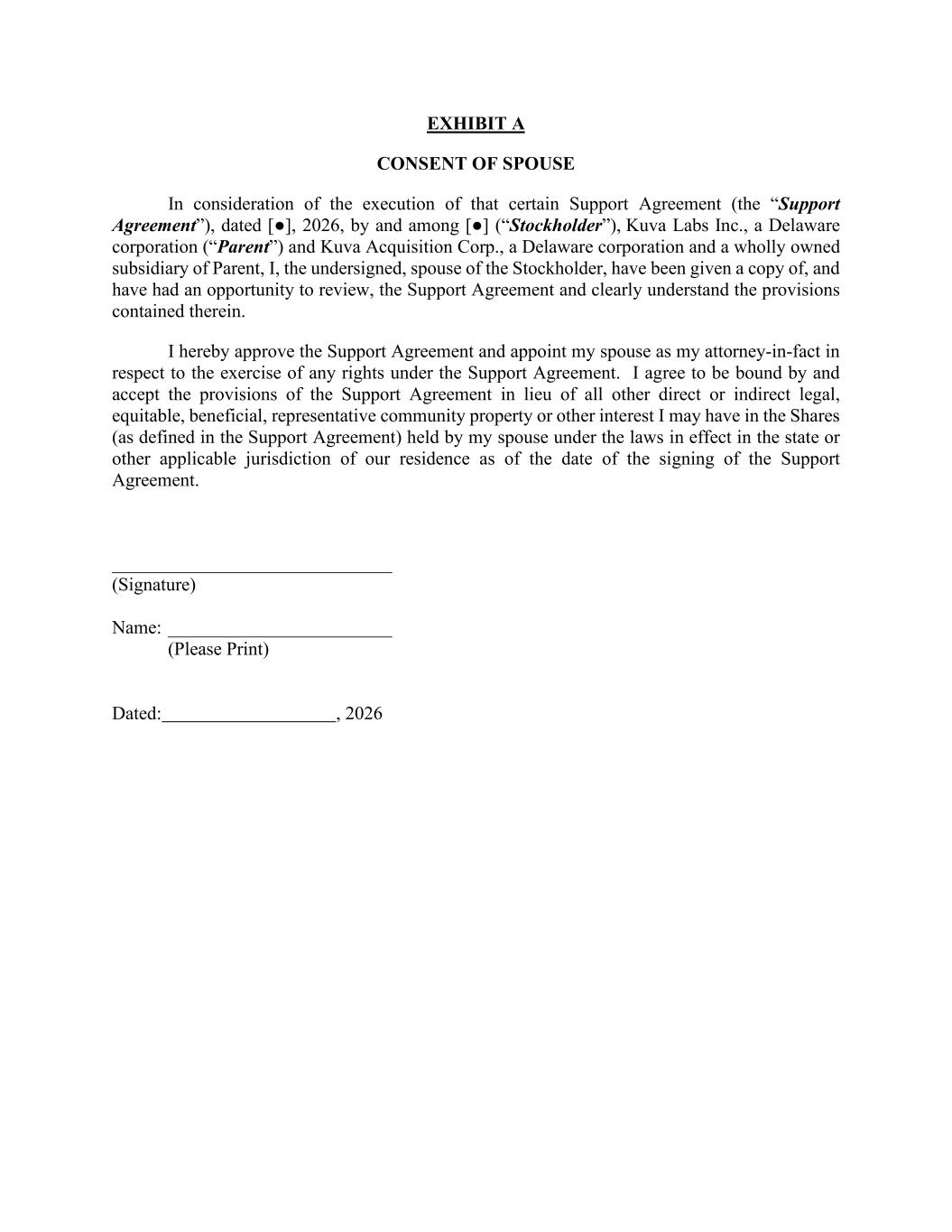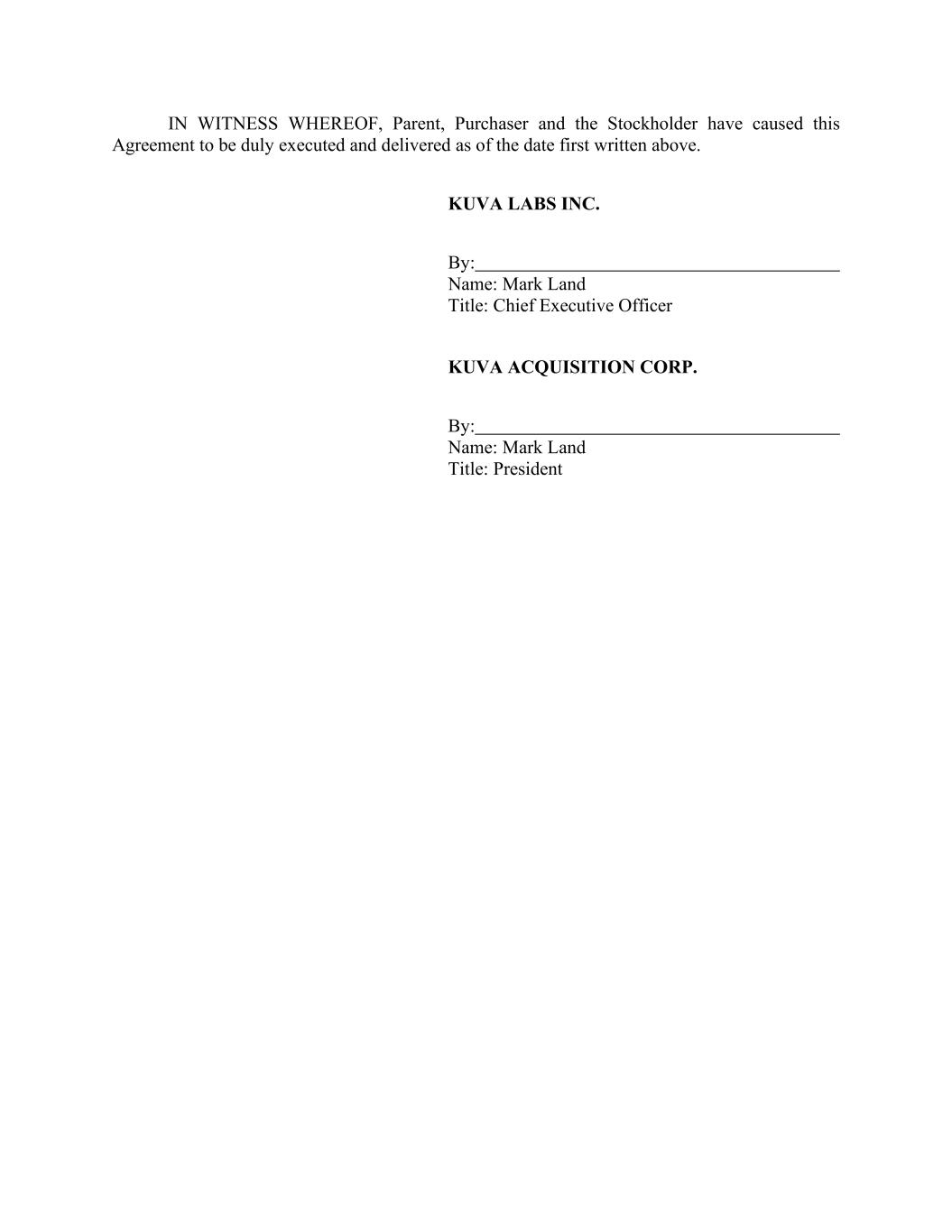 [Signature Page to Agreement and Plan of Merger] IN WITNESS WHEREOF, each of Parent, Purchaser and the Company has caused this Agreement to be executed as of the date first written above by their respective officers thereunto duly authorized. KUVA LABS INC. By: /s/ Mark Land _______________ Name: Mark Land Title: Chief Executive Officer