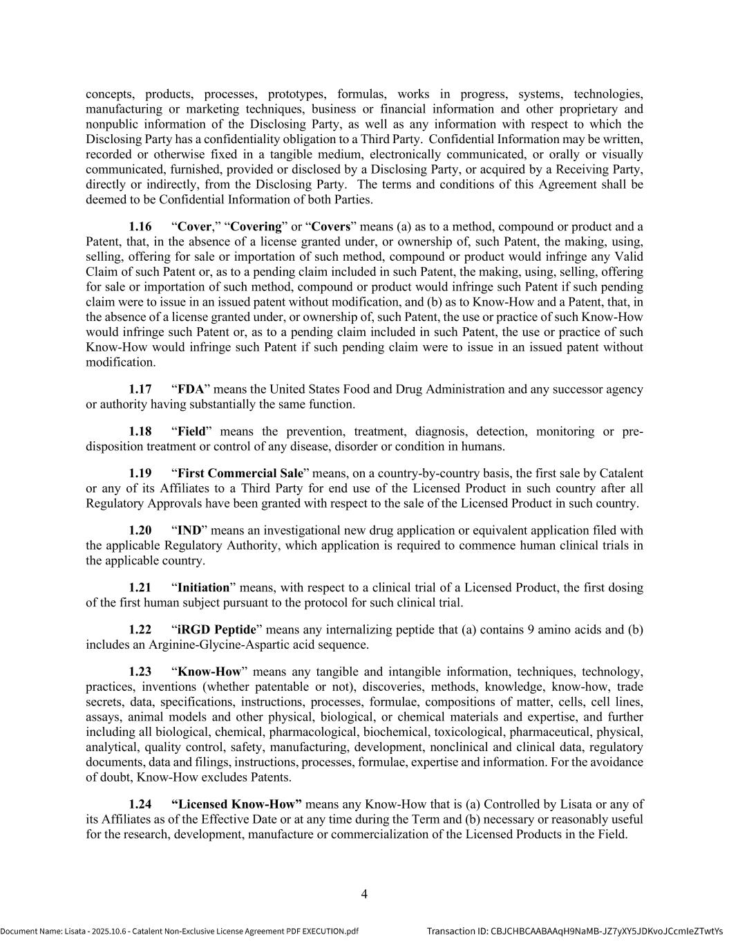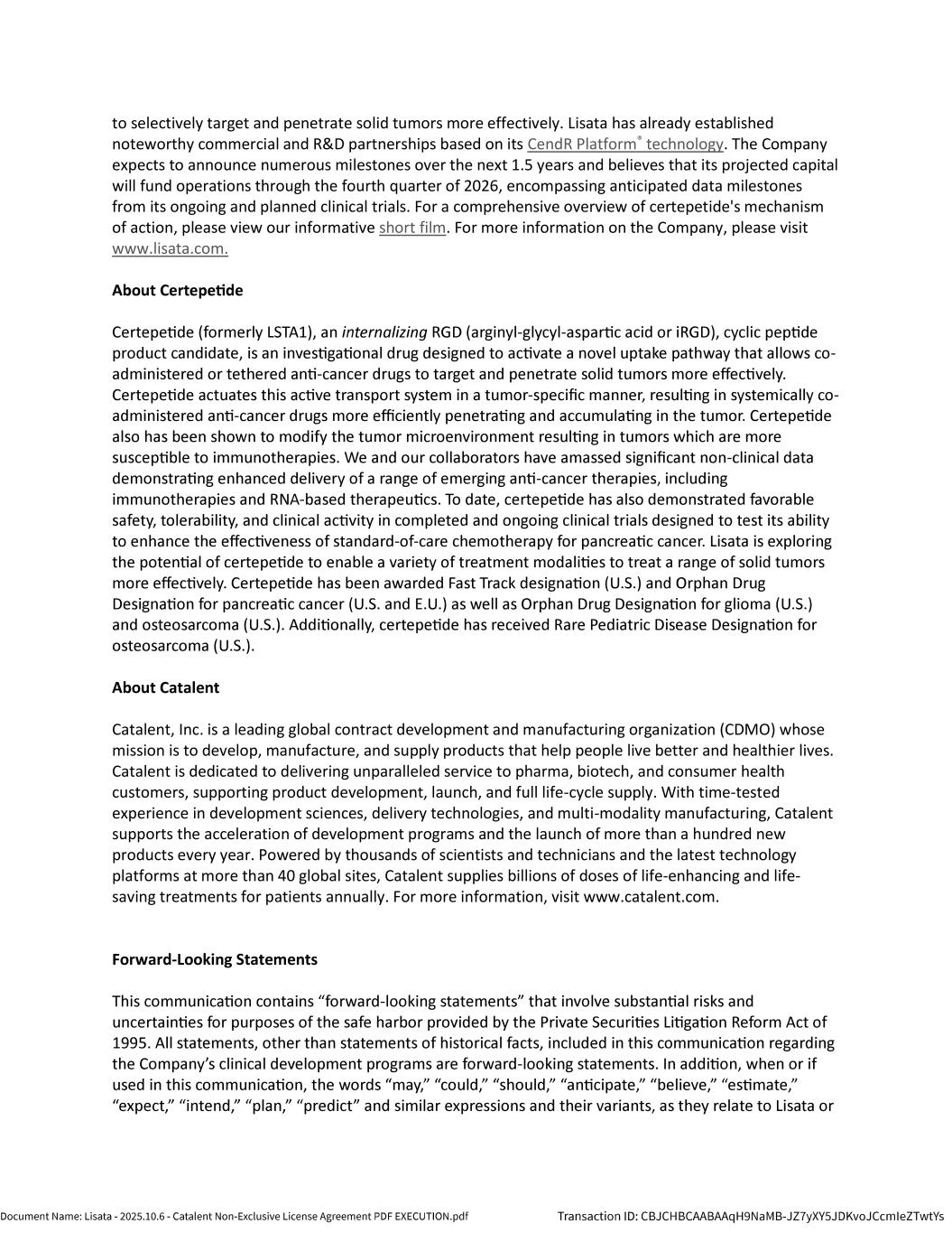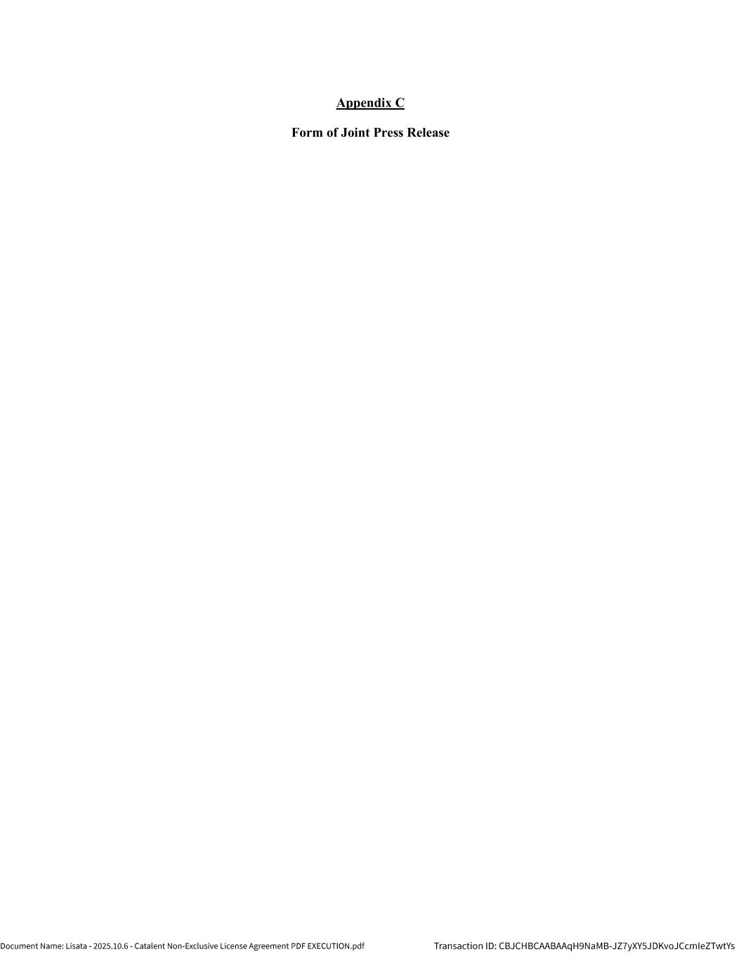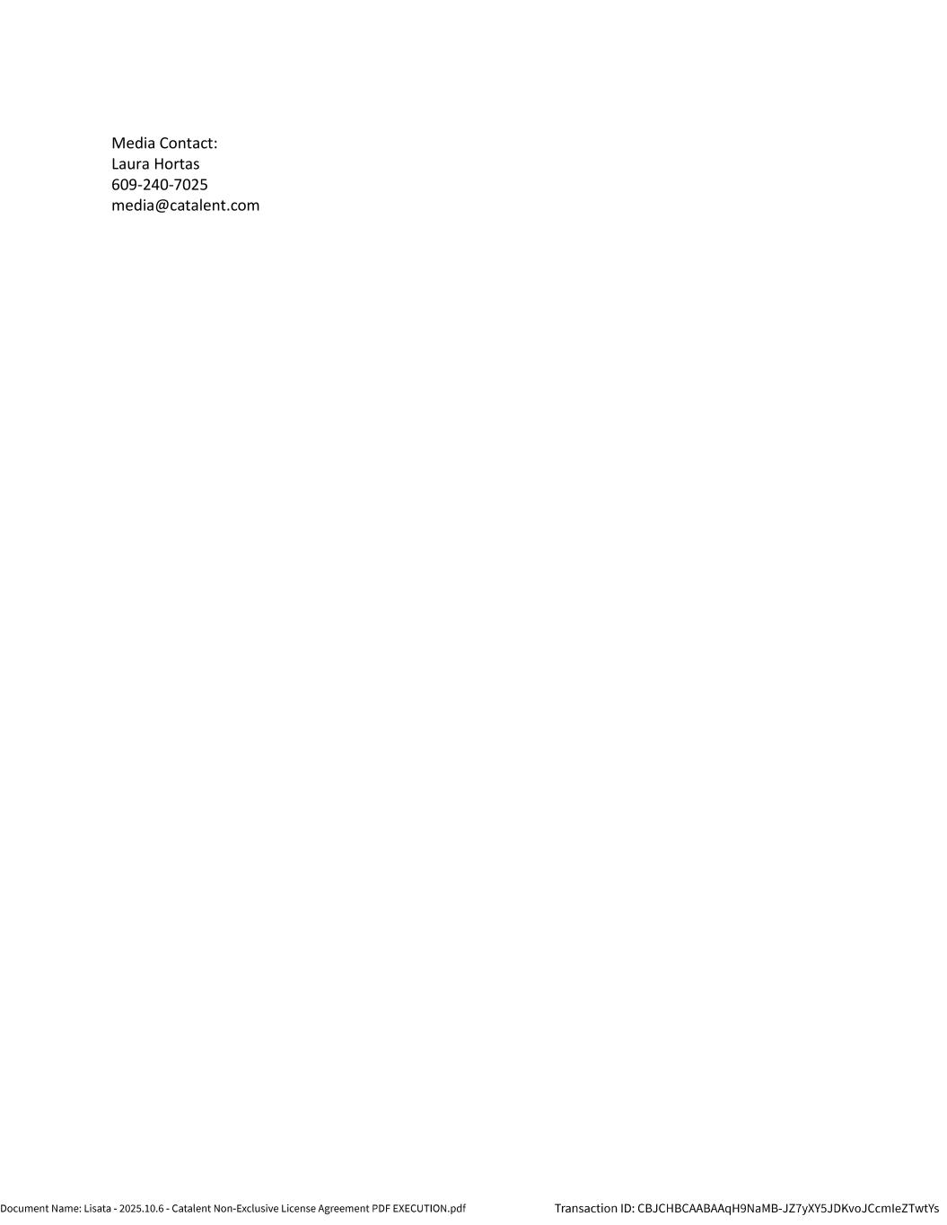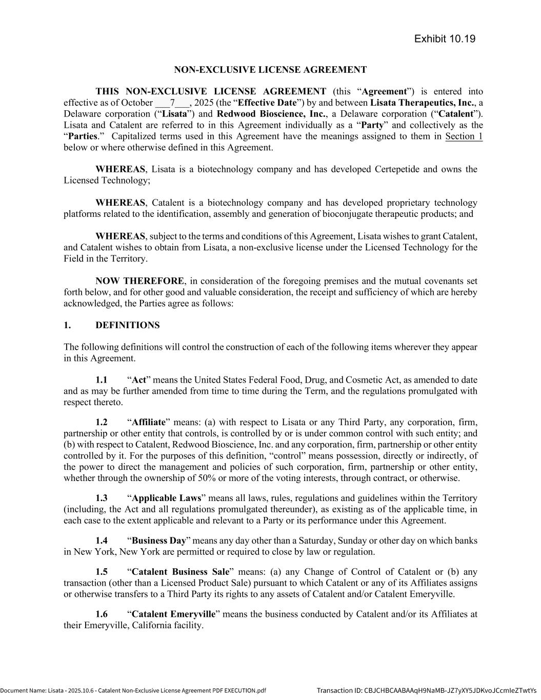 | | Non-Exclusive License Agreement, dated as of October 8, 2025, by and between Lisata Therapeutics, Inc. and Catalent, Inc. |