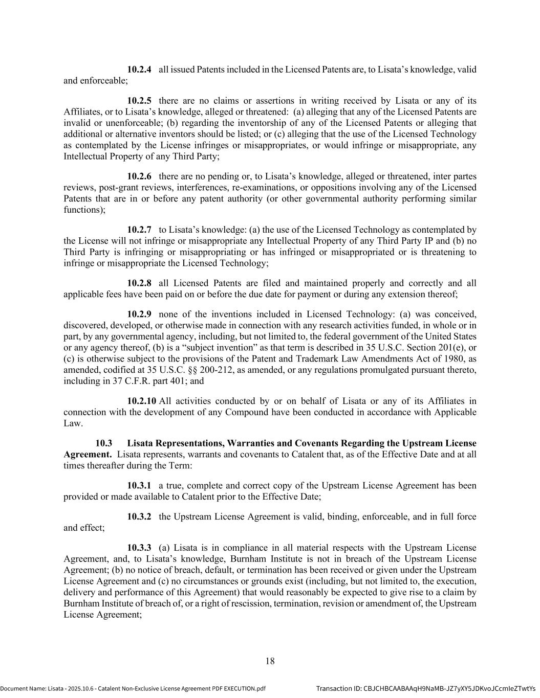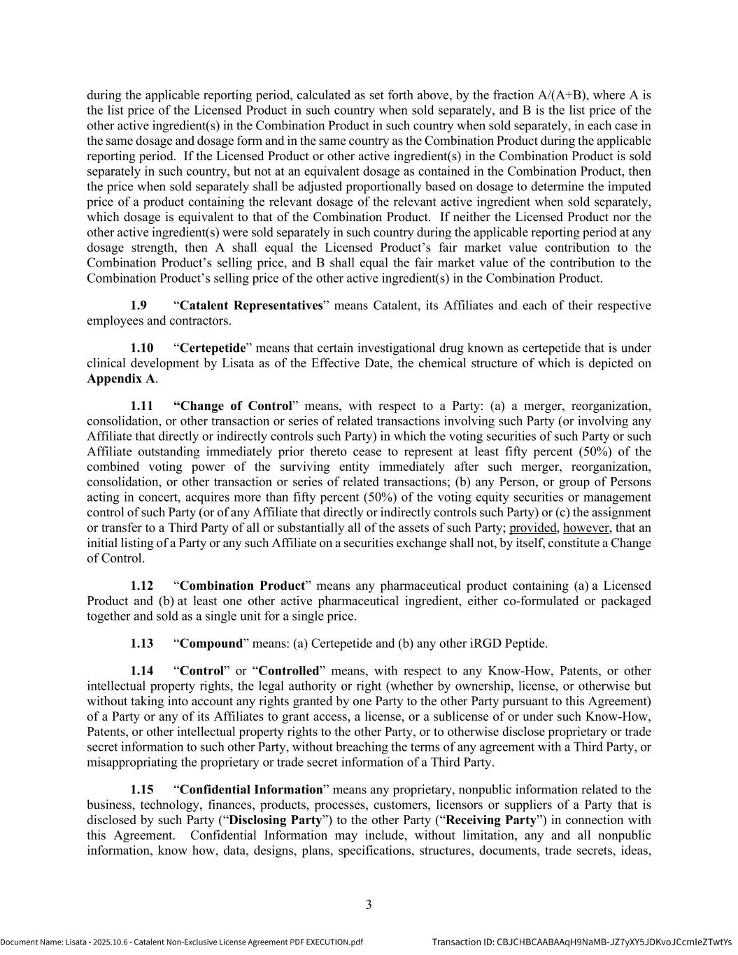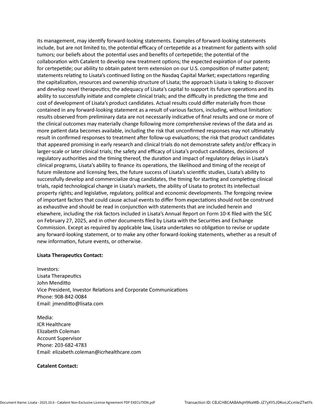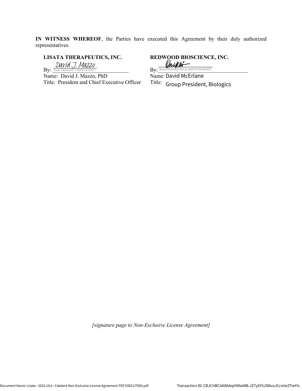 | | Non-Exclusive License Agreement, dated as of October 8, 2025, by and between Lisata Therapeutics, Inc. and Catalent, Inc. |