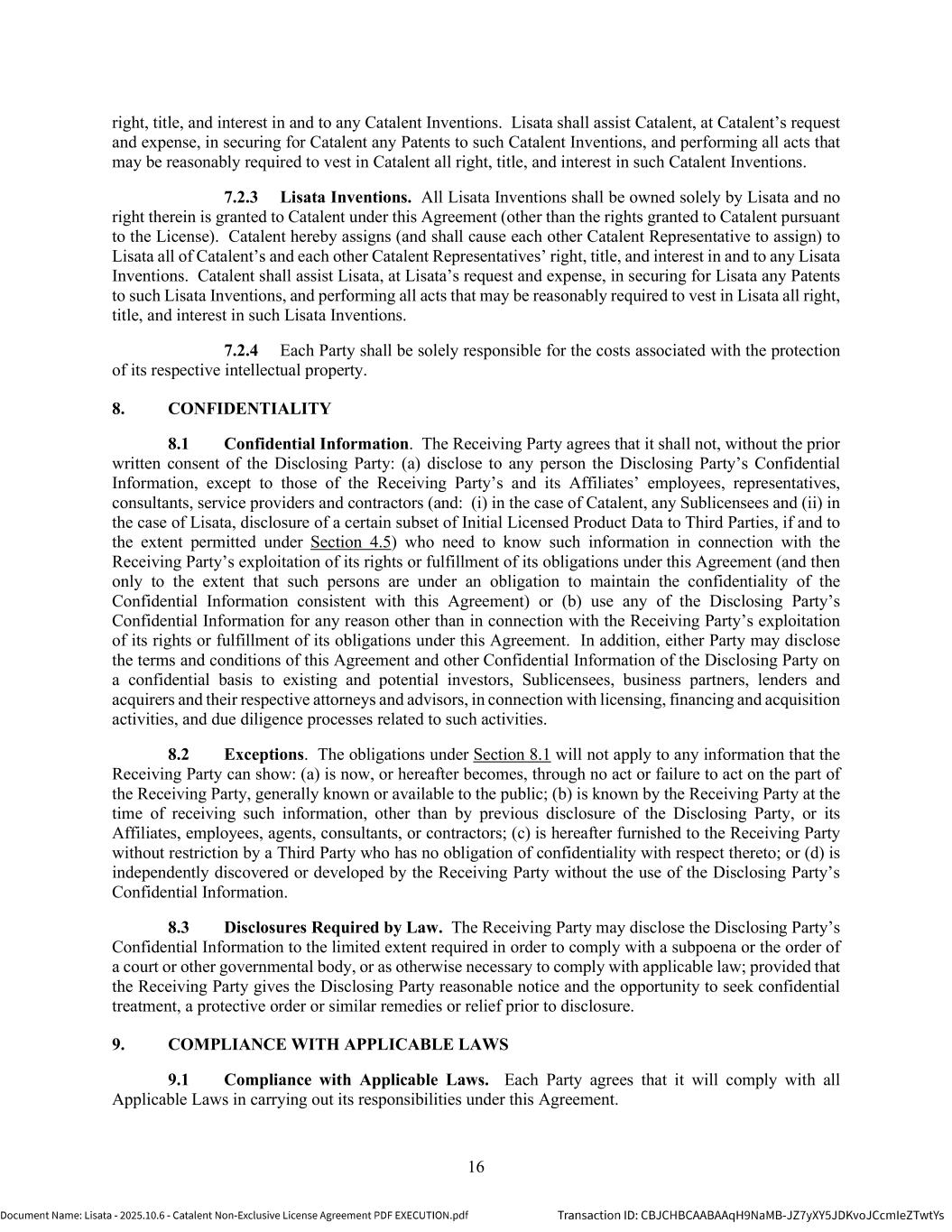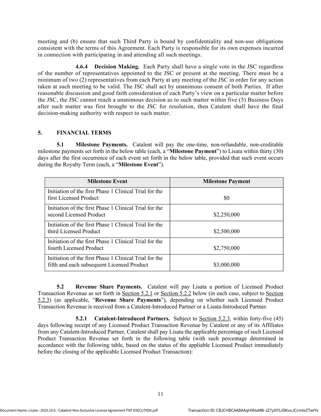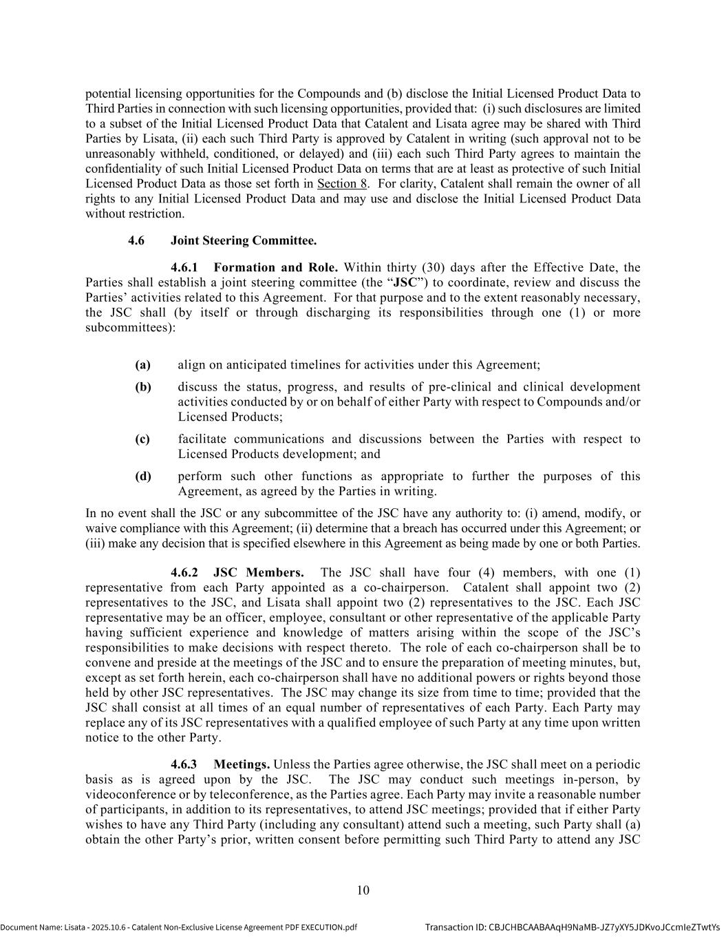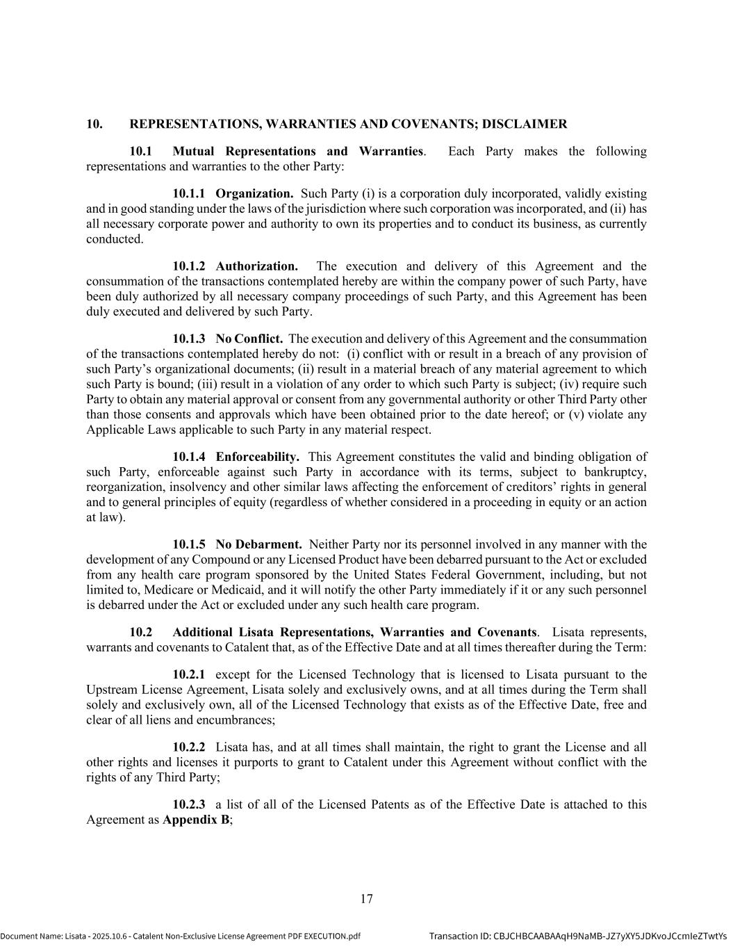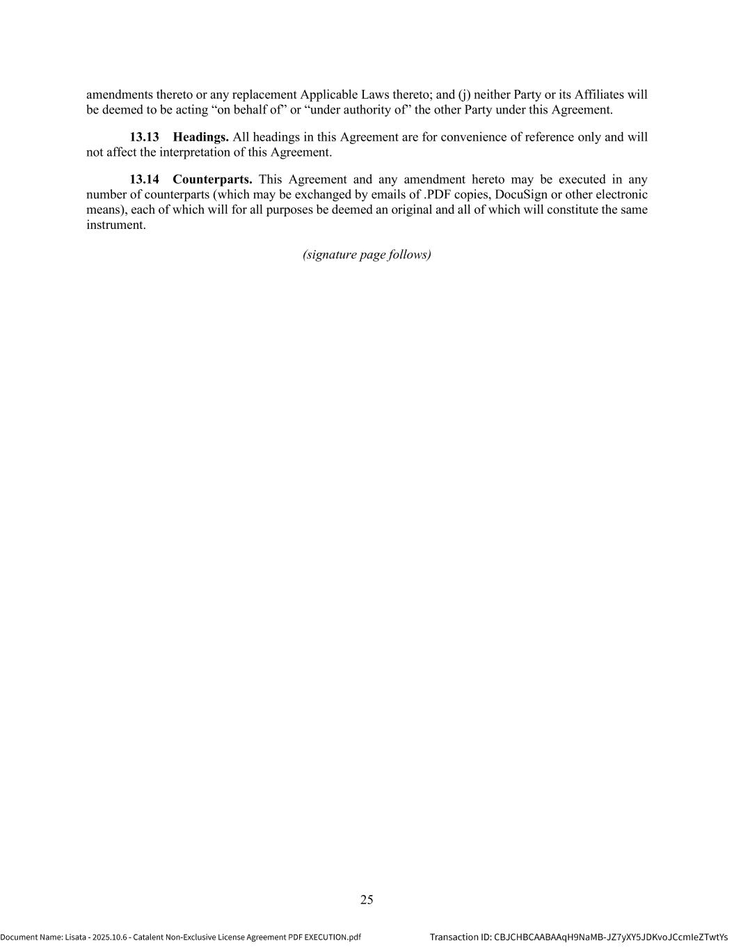 | | Non-Exclusive License Agreement, dated as of October 8, 2025, by and between Lisata Therapeutics, Inc. and Catalent, Inc. |