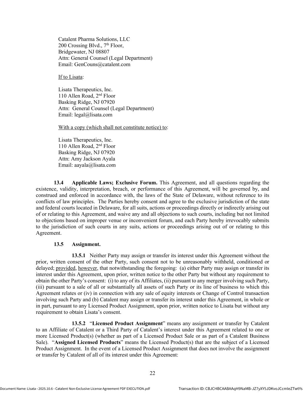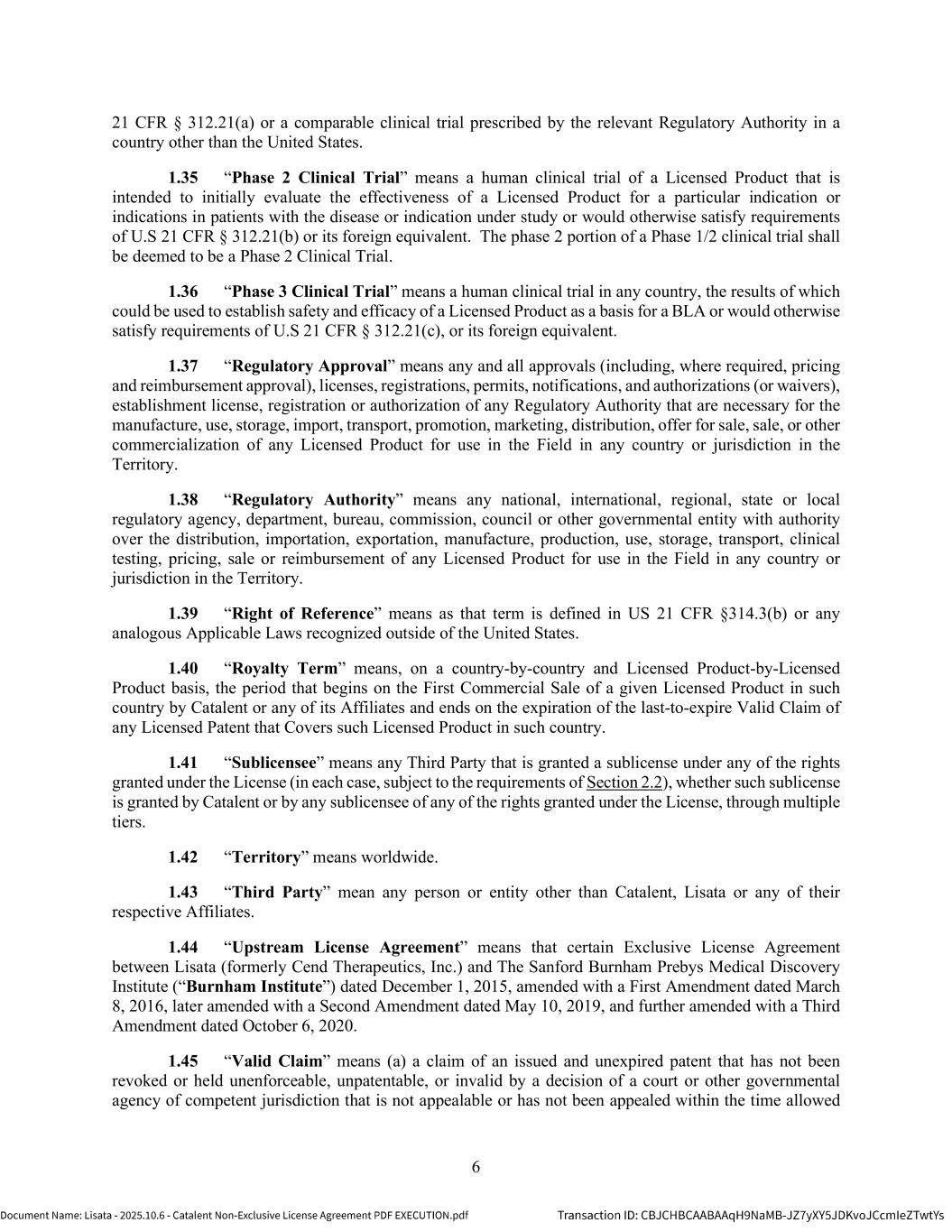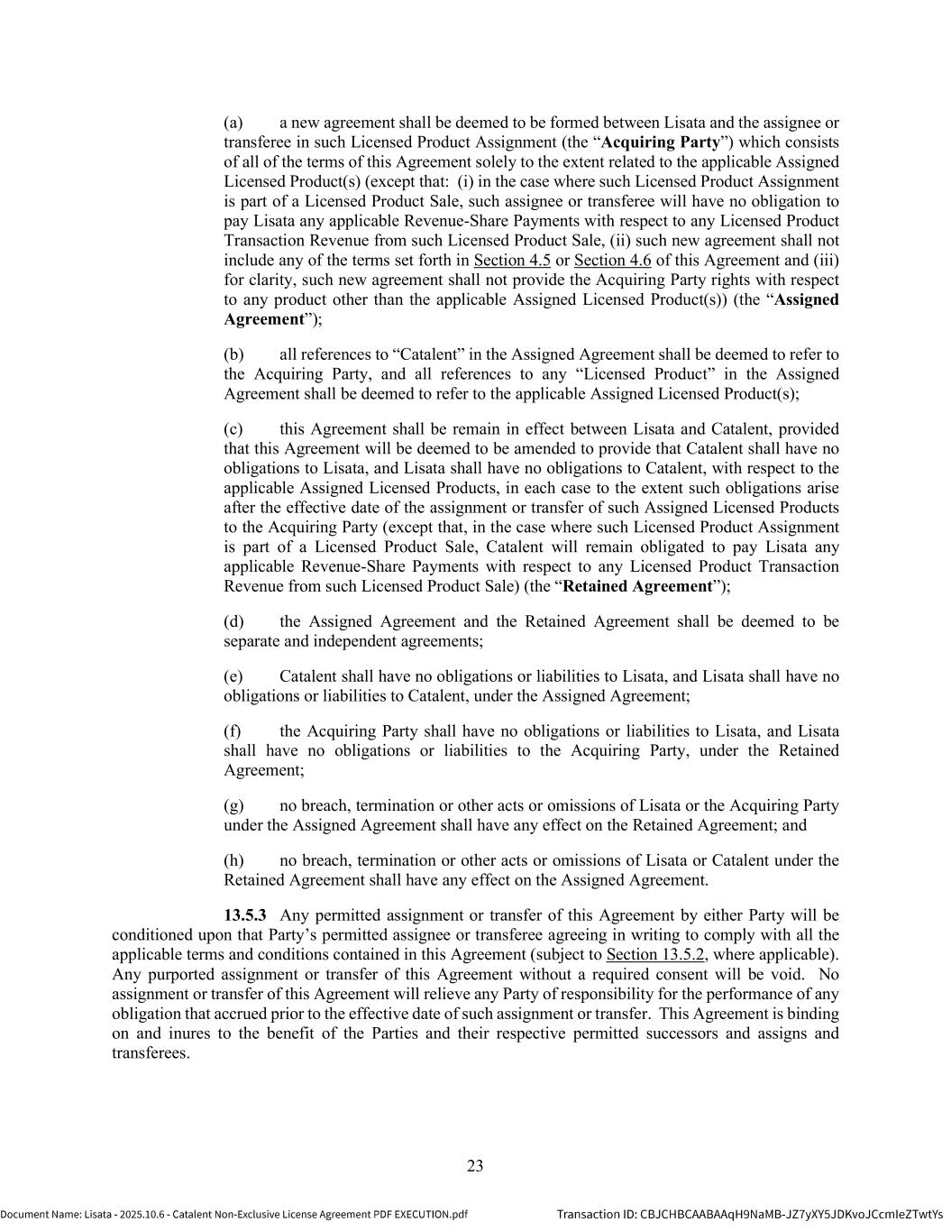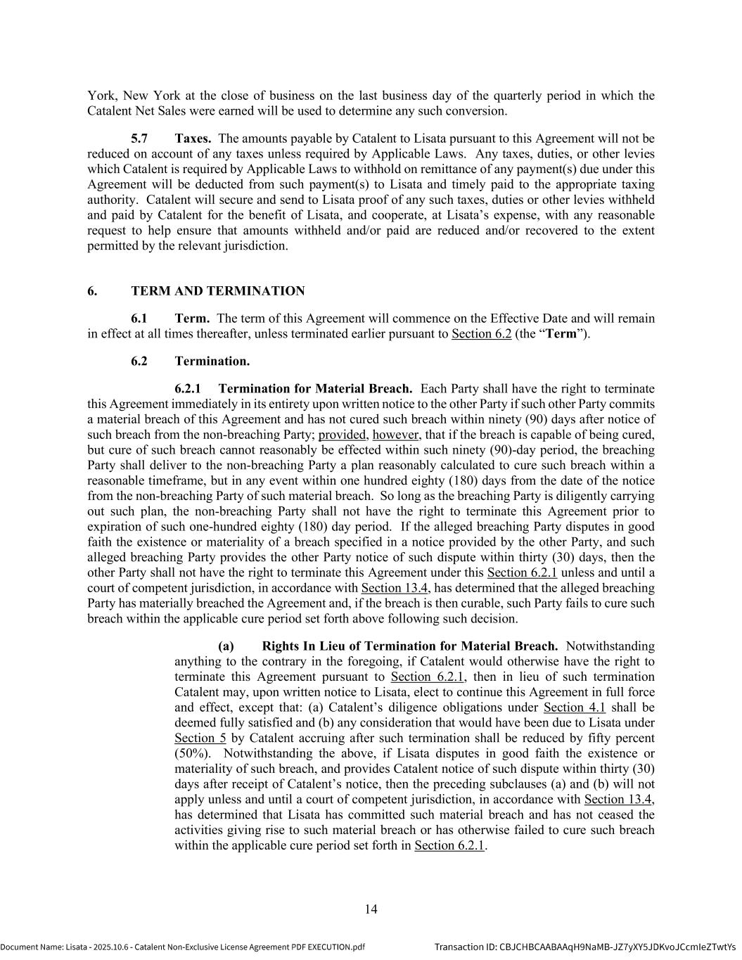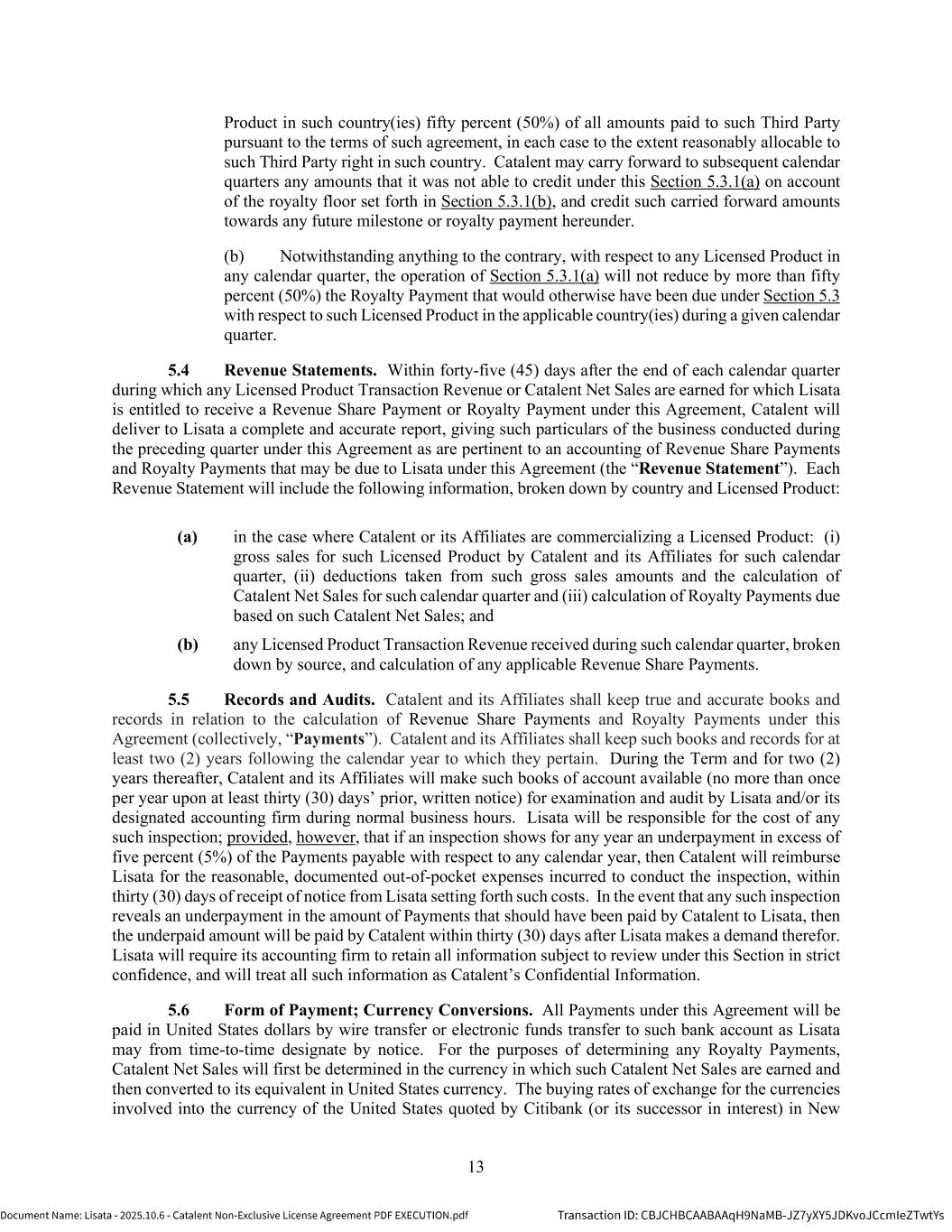 | | Non-Exclusive License Agreement, dated as of October 8, 2025, by and between Lisata Therapeutics, Inc. and Catalent, Inc. |