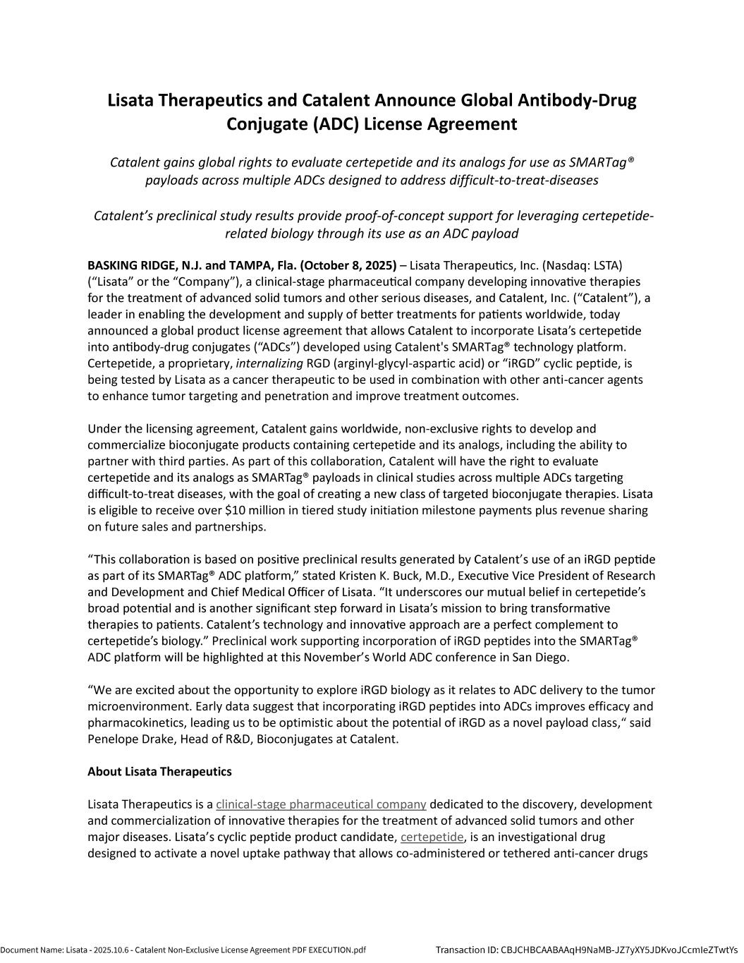 Lisata Therapeutics, Inc. (together with its subsidiaries, the “Company”) is a clinical-stage pharmaceutical company dedicated to the discovery, development, and commercialization of innovative therapies for the treatment of solid tumors and other serious diseases. Our investigational product, certepetide (formerly known as LSTA1 or CEND-1), is designed to activate a novel uptake pathway (the C-end rule active transport mechanism) that allows co-administered or tethered (i.e., molecularly bound) anti-cancer drugs to target and penetrate solid tumors more effectively. Certepetide actuates this active transport system in a tumor-specific manner, resulting in systemically co-administered anti-cancer drugs more efficiently penetrating and accumulating in the tumor, while normal tissues are expected to remain unaffected. Certepetide has also been shown to modify the tumor microenvironment (“TME”) by reducing T-regulatory cells and augmenting cytotoxic T cells, thereby making tumors more susceptible to immunotherapies while also inhibiting the metastatic cascade (i.e., the spread of cancer to other parts of the body). We, our collaborators and other researchers have amassed and continue to amass significant non-clinical data demonstrating enhanced delivery of a range of existing and emerging anti-cancer therapies, including chemotherapeutics, immunotherapies, and RNA-based therapeutics. In addition, certain preclinical data using certepetide in combination with antibody drug conjugates (ADCs) has been generated as part of our research collaboration with Catalent. These data were presented at a scientific meeting during the fourth quarter of 2025. To date, certepetide has also demonstrated favorable safety, tolerability and activity in completed and ongoing clinical trials designed to enhance delivery of standard-of-care chemotherapy, with and without added immunotherapy, for pancreatic cancer. Certepetide is or has been the subject of several Phase 2 clinical studies globally in a variety of solid tumor types, including metastatic pancreatic ductal adenocarcinoma (mPDAC), cholangiocarcinoma, appendiceal cancer, colon cancer and glioblastoma multiforme in combination with a variety of anti-cancer regimens.
