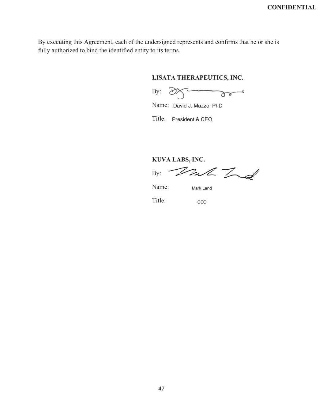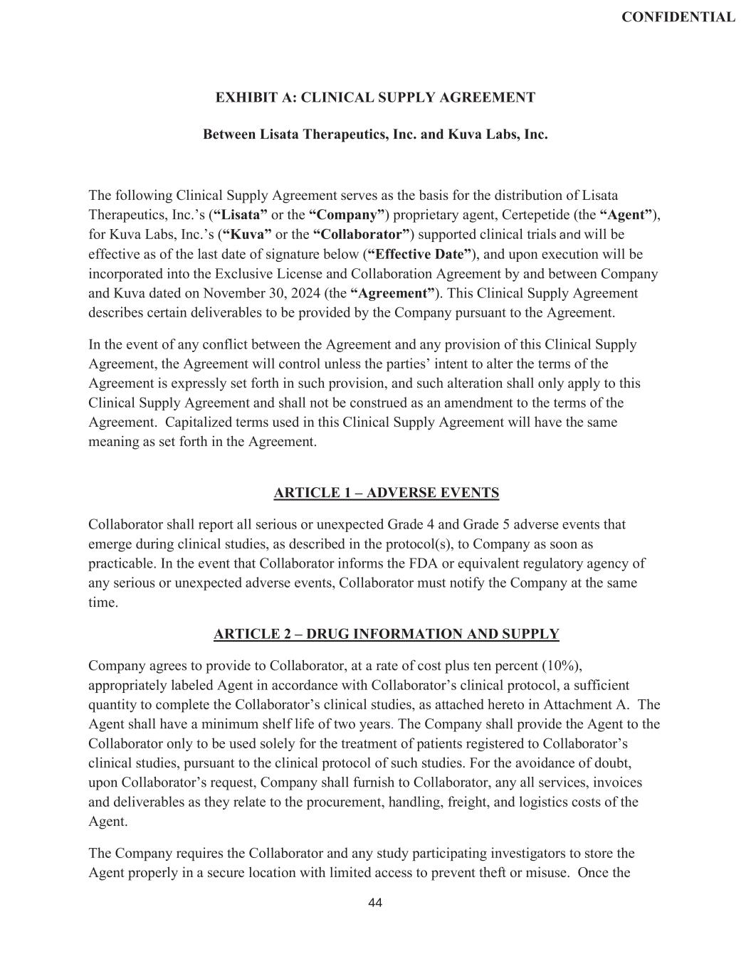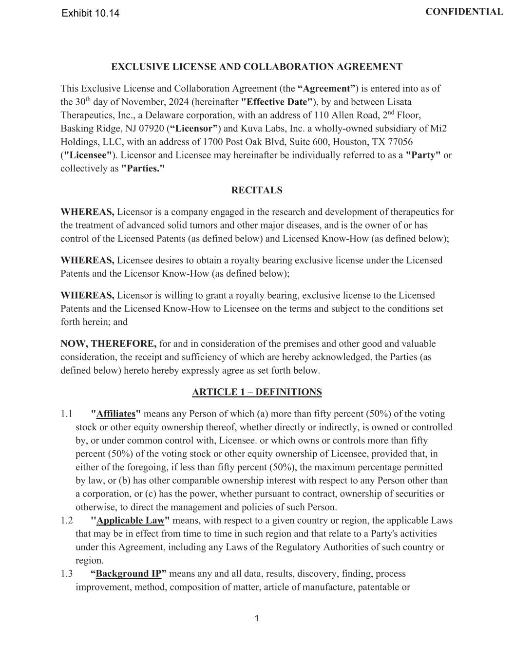| | Exclusive License and Collaboration Agreement, dated as of November 30, 2024, by and between Lisata Therapeutics, Inc. and Kuva Labs, Inc. |